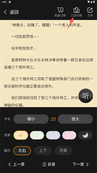 1、点击阅读页面中间区域,呼出菜单,右上角可以选择加入书架和分享。