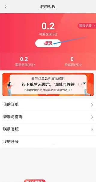 进入返现详情页后,点击「提现」按钮,根据提示输入需要接收返现金额的支付宝账号及真实姓名,确认信息无误后提交申请即可完成提现。